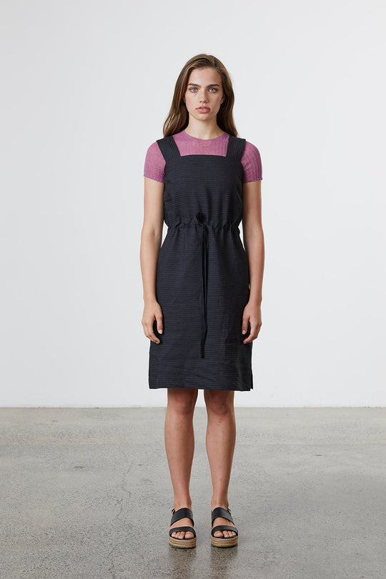 A relaxed, knee length dress crafted in the finest 100% Linen, featuring a square neckline and dual patch pockets. A drawstring waist detail allows for a softly gathered back and an adjustable fit. Wear yours with a cotton tulle tee or on its own on warmer days.